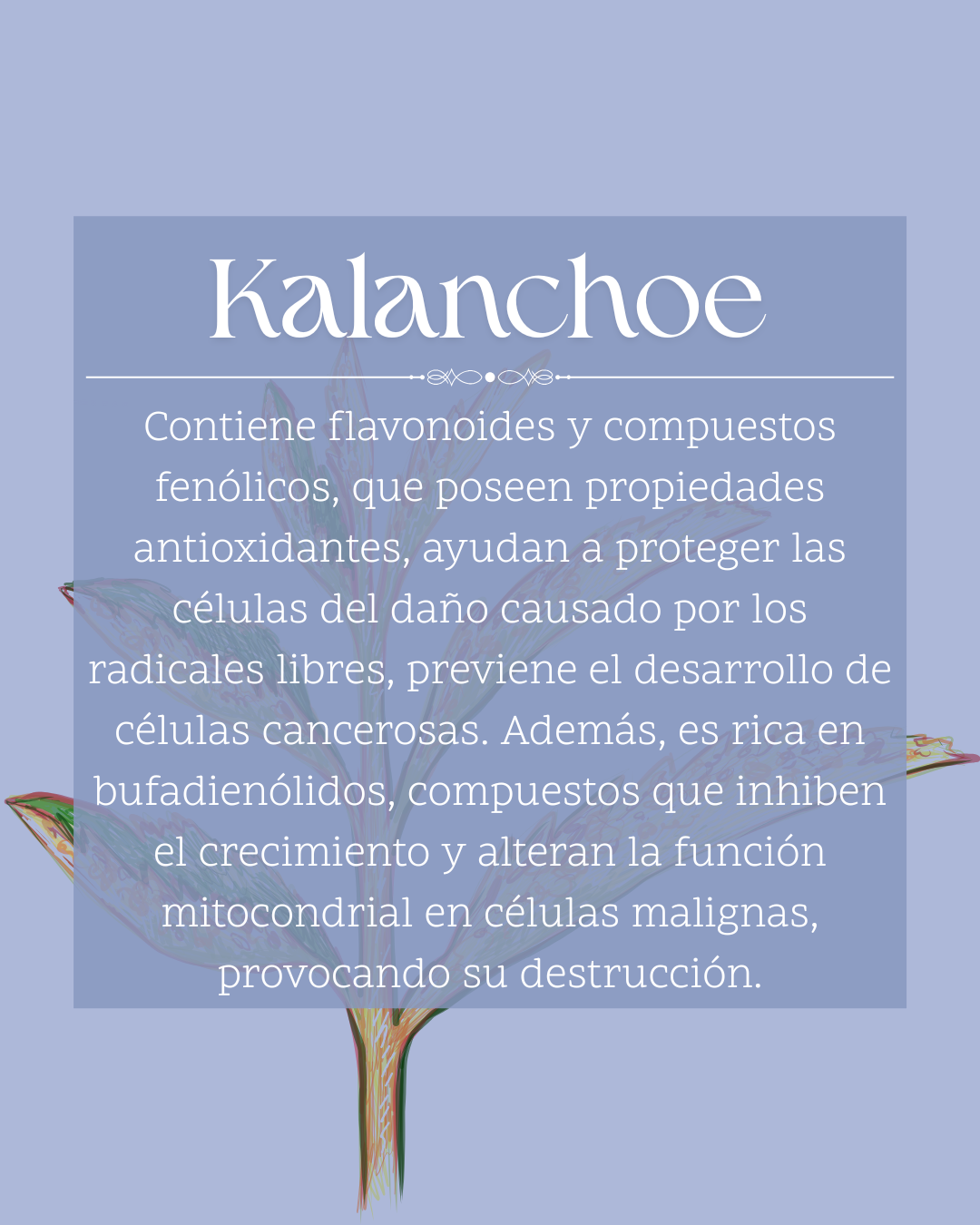 Nuestra tintura madre de Kalanchoe 60 mL ofrece las propiedades de esta planta medicinal en un formato m谩s accesible y f谩cil de transportar. Apoya al organismo de forma natural, contribuye a la desinflamaci贸n y promueve la vitalidad.